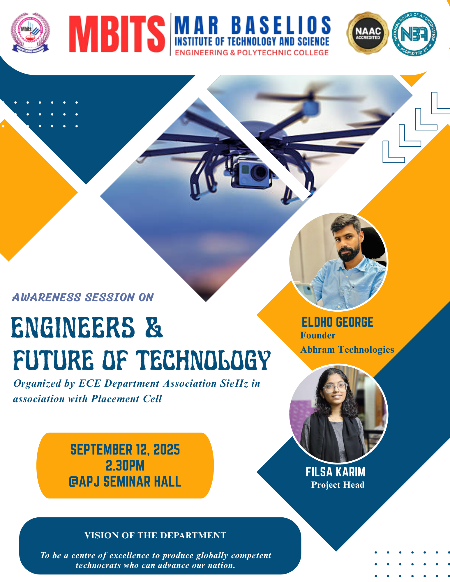 An awareness session on “Engineers & the Future of Technology” was conducted in collaboration with Abhram Technologies Pvt. Ltd., led by Mr. Eldo George and Ms. Filsa Karim. The session focused on cutting-edge domains such as Drones, Robotics, and Artificial Intelligence, aiming to provide students with valuable insights into future engineering trends and the evolving role of engineers in driving innovation.