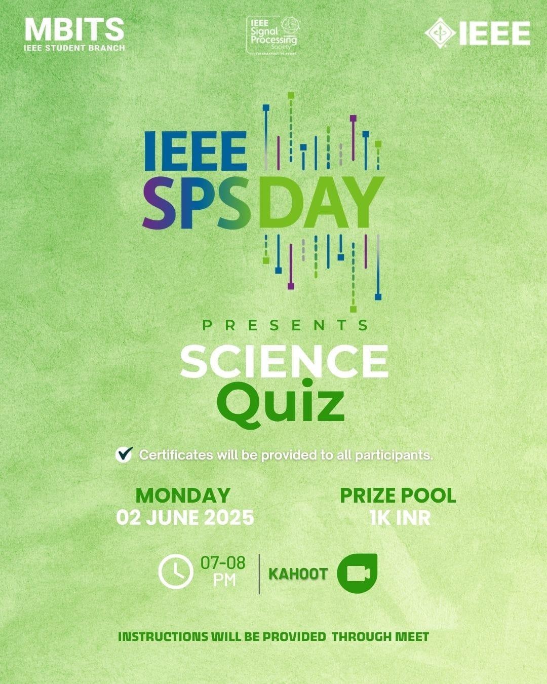 The MBITS IEEE Student Branch, in collaboration with the IEEE Signal Processing Society, organized a virtual Science Quiz on Monday, 2nd June 2025, from 7:00 PM to 8:00 PM, as part of the IEEE SPS Day celebrations.