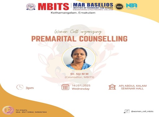 The Women’s Cell at MBITS, Kothamangalam organized a premarital counselling session for all the final year girls of the college. The event took place in the APJ Abdul Kalam Seminar Hall, MBITS. The primary objective of the session was to equip the students with the right knowledge to build a strong, healthy and lasting marriage. Dr. Siji M M facilitated the session, addressing queries and providing personalized advice to help them overcome specific challenges. She enlightened students with the right steps to         choose  a           partner and            foster    understanding