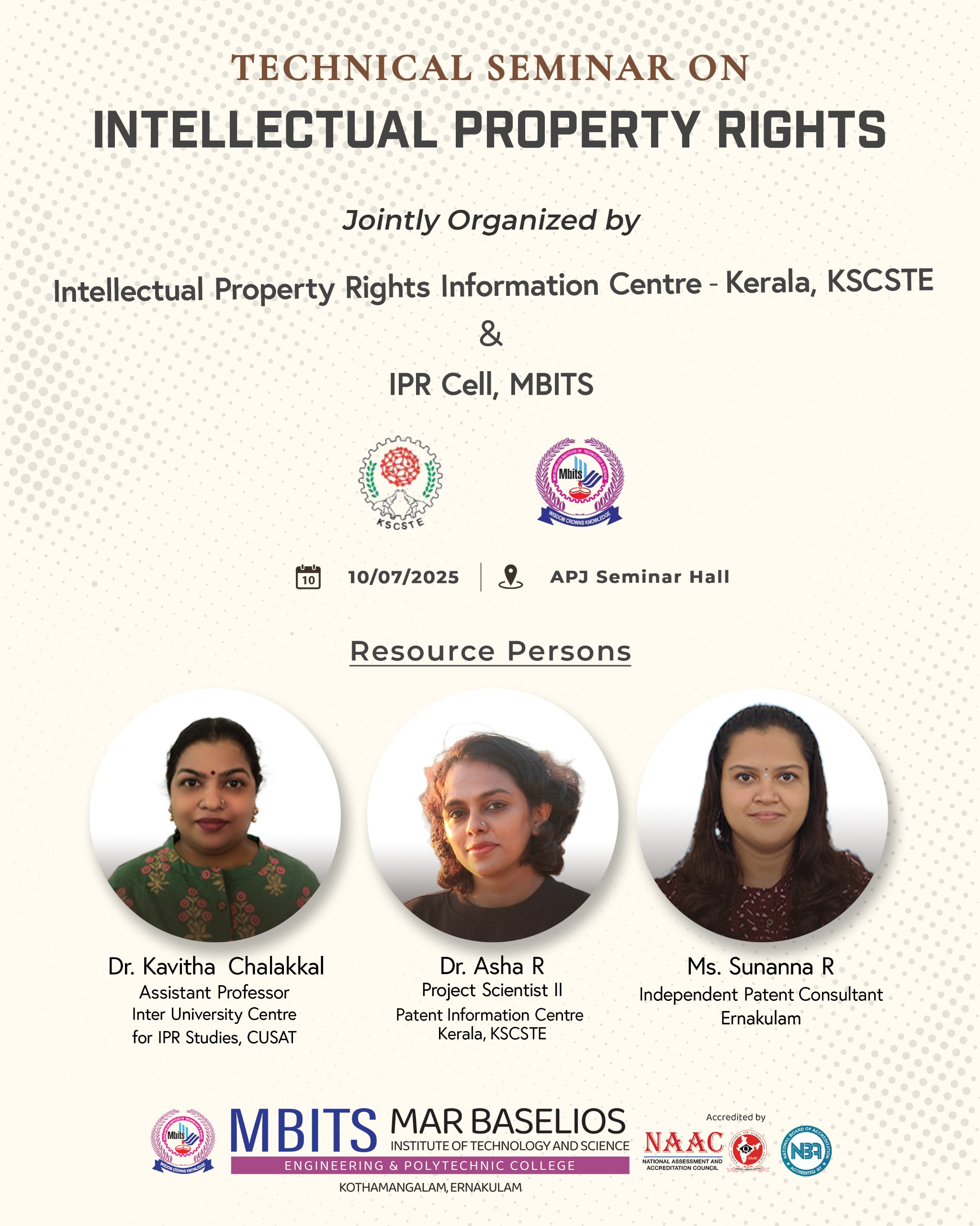 A seminar on Intellectual Property Rights (IPR) was held on July 10, 2025, at Mar Baselios Institute of Technology and Science, Kothamangalam, in collaboration with the KSCSTE Intellectual Property Rights Information Centre – Kerala. Aimed at raising awareness on IPR among budding innovators and academic professionals, the seminar primarily benefited B.Tech students involved in major academic projects, along with faculty from various departments. A total of 77 participants attended the event. The sessions provided practical insights into protecting and developing innovative ideas. Dr. Kavitha Chalakkal from CUSAT discussed the role of IPR in safeguarding innovation, while Dr. Asha R from KSCSTE explained the Indian patent system and filing process. Ms. Sunanna R, a Patent Consultant, introduced patent search strategies vital for effective research. The seminar encouraged active participation and concluded with a vote of thanks by Mr. Jibin Wilson, leaving attendees better equipped to protect their intellectual efforts.