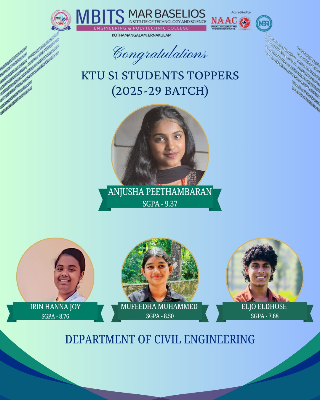 Congratulations to the students with SGPA above 8 from S1 B.Tech Degree Examination from Department of Civil Engineering.