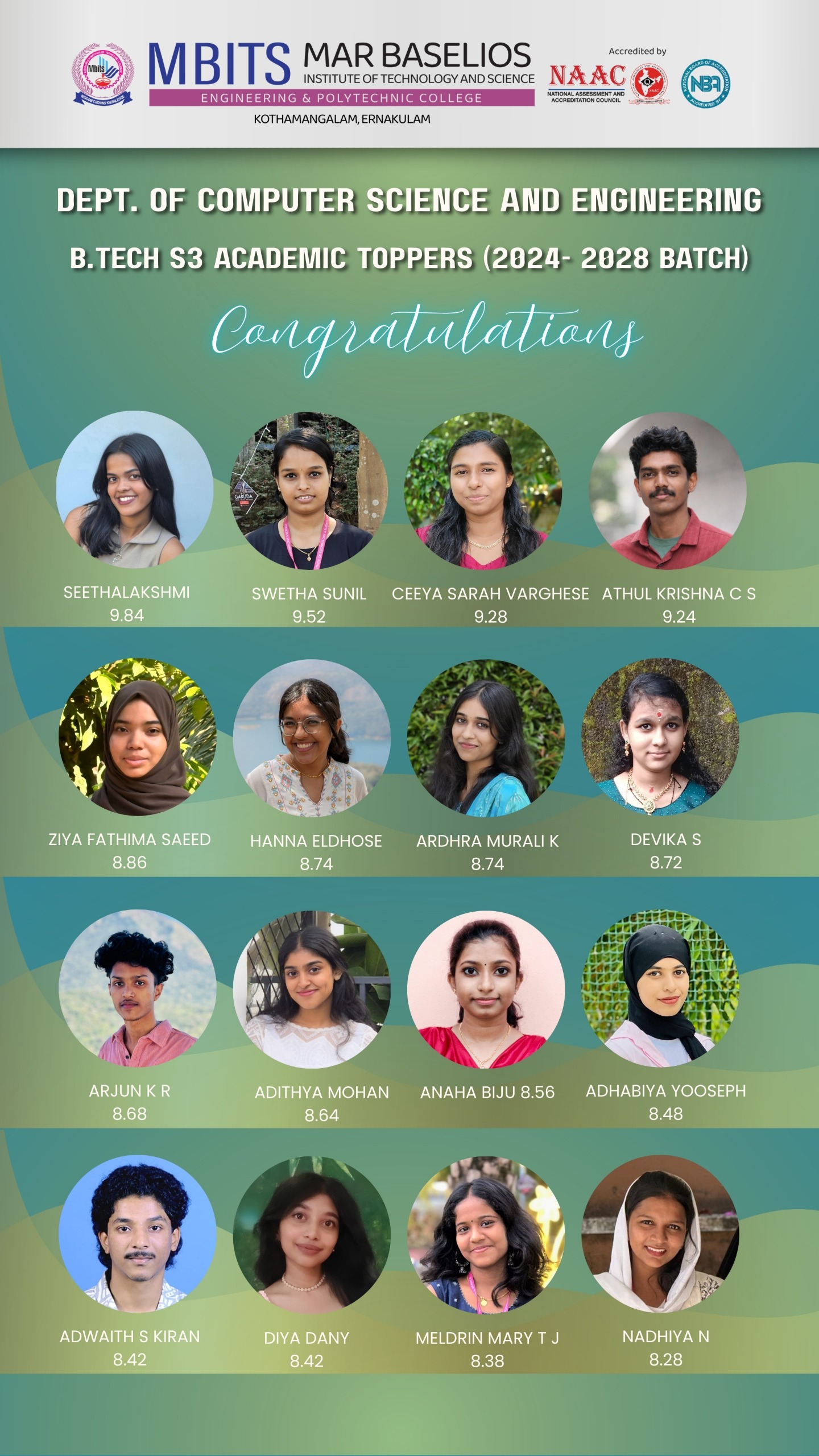 Congratulations to students with SGPA above 8 from S3 B.Tech Degree Examination from Department of Computer Science and Engineering