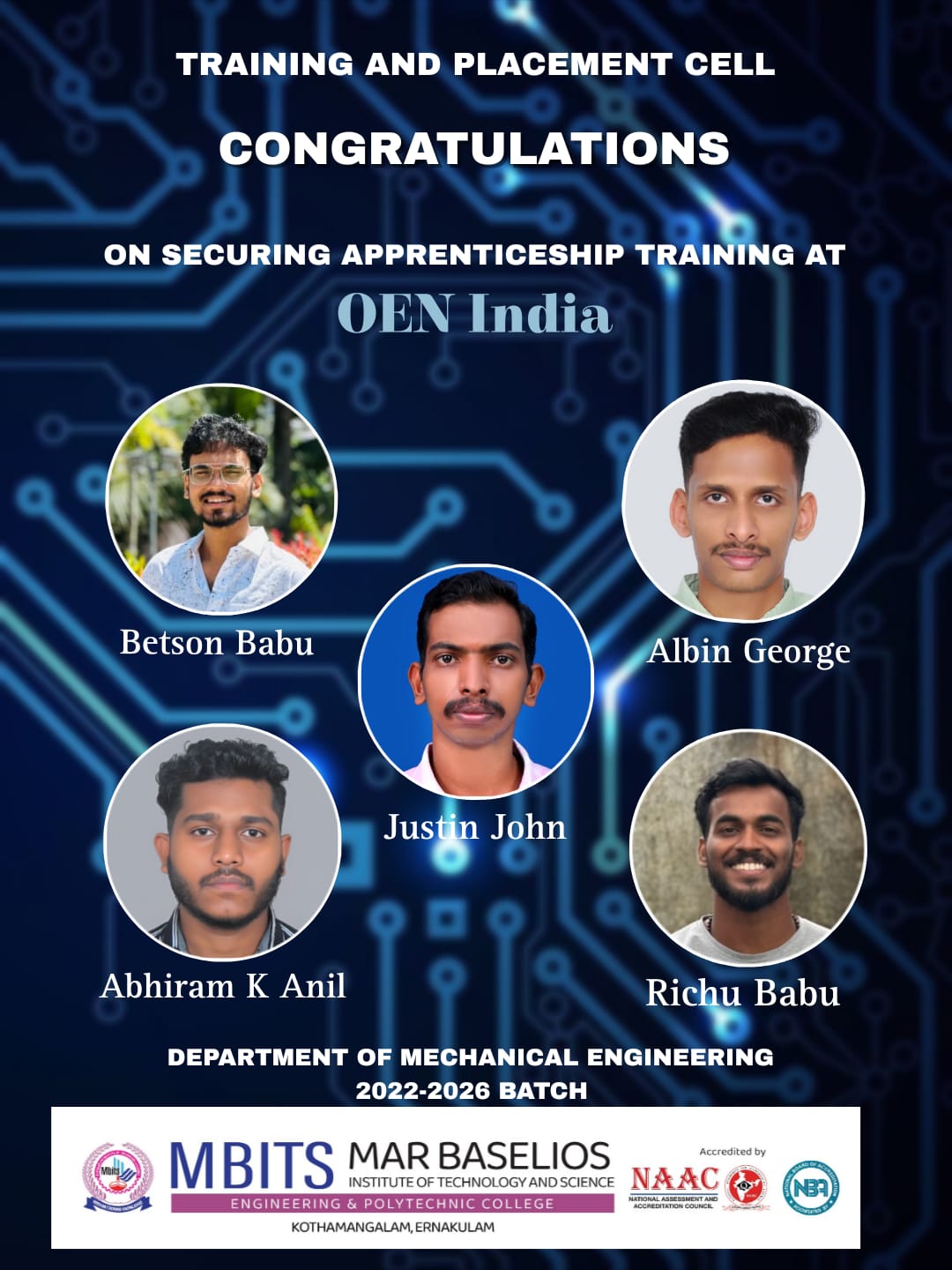 Congratulations for securing Apprenticeship at OEN India from Department of Mechanical Engineering.