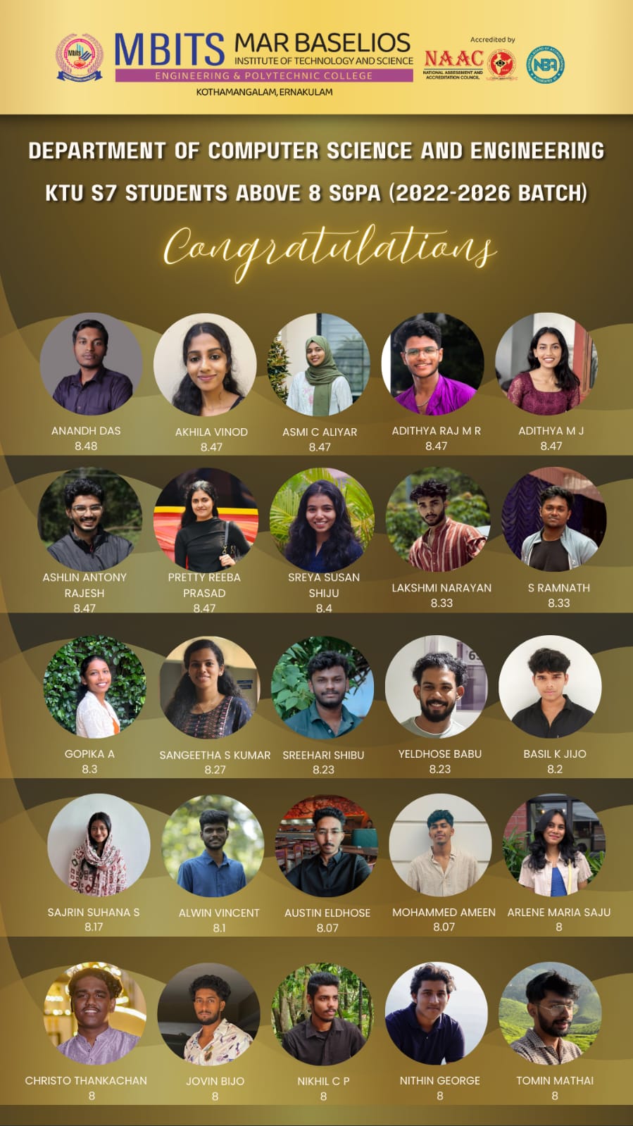 Congratulations to students with SGPA above 8 from S7 BTech Degree Examination from Department of Computer Science and Engineering
