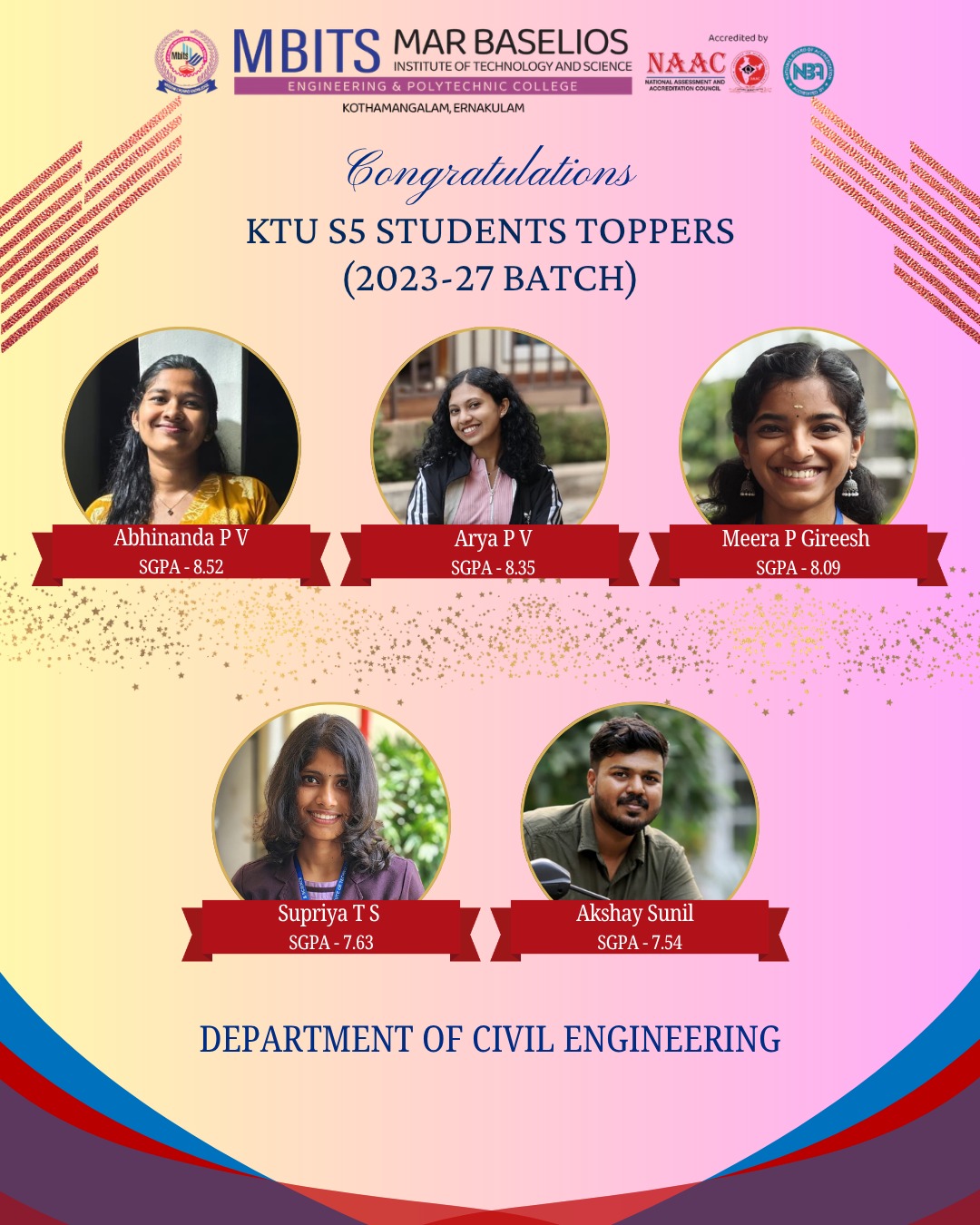 Congratulations to the students with SGPA above 8 from S5 B.Tech Degree Examination from Department of Civil Engineering.