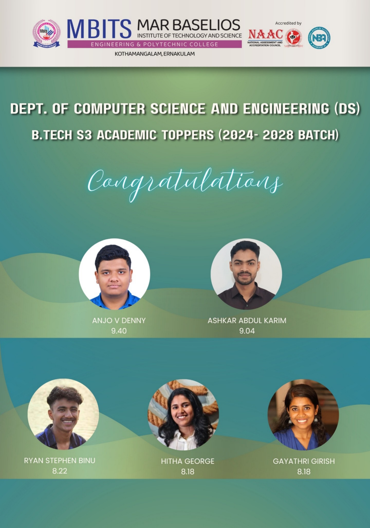 Congratulations to students with SGPA above 8 from S3 B.Tech Degree Examination from Department of Computer Science and Engineering (DS)