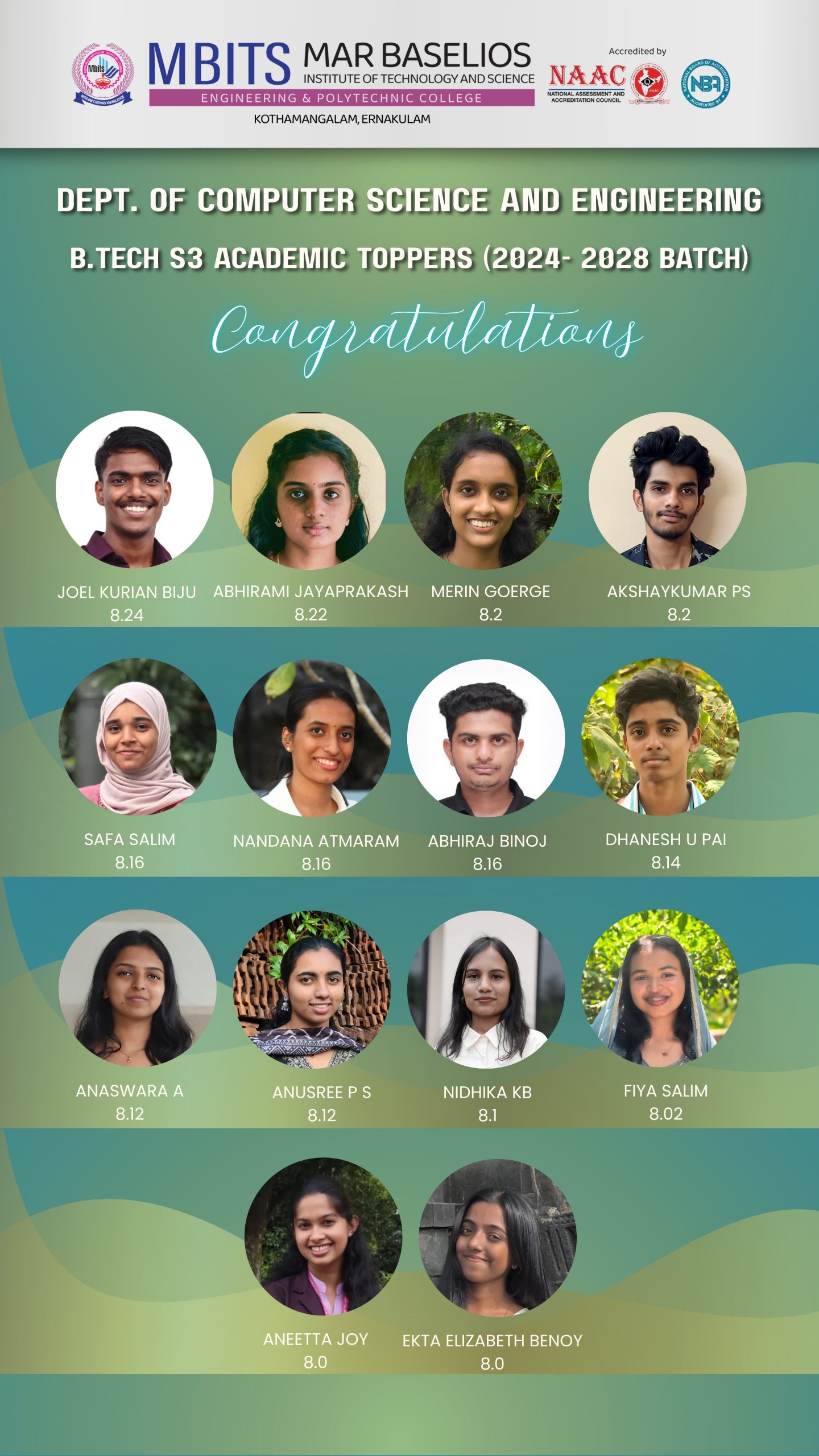 Congratulations to students with SGPA above 8 from S3 B.Tech Degree Examination from Department of Computer Science and Engineering