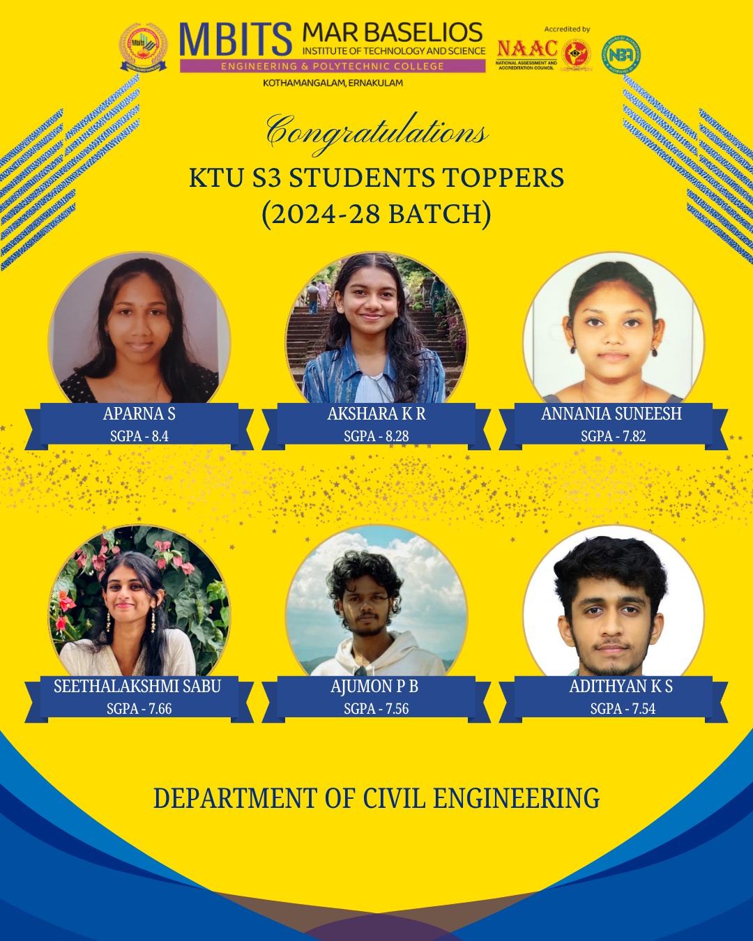 Congratulations to students with SGPA above 8 from S3 B.Tech Degree  Examination from Department of Civil Engineering