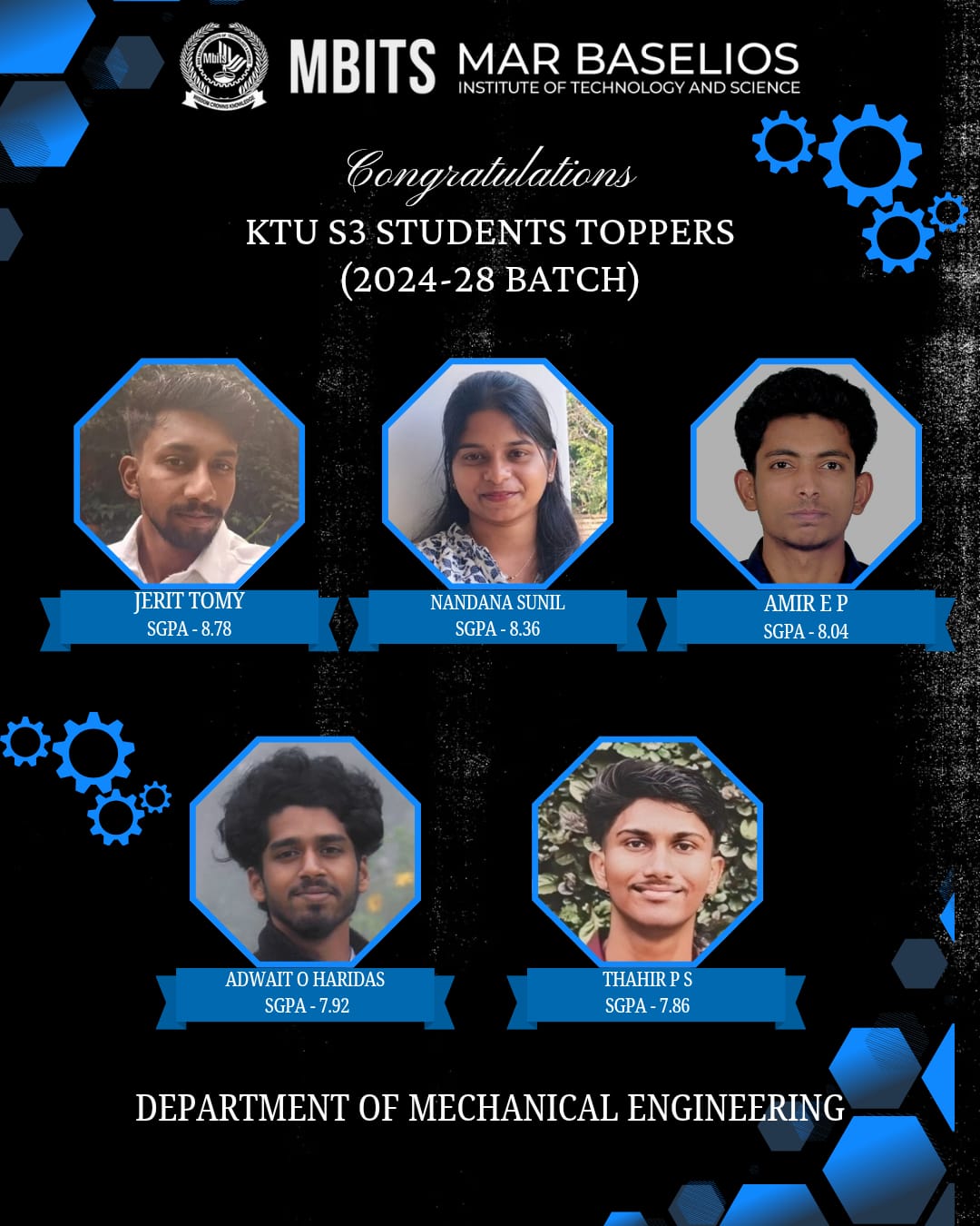 Congratulations to students with SGPA above 7 from S3 B.Tech Degree Examination from Department of Mechanical Engineering