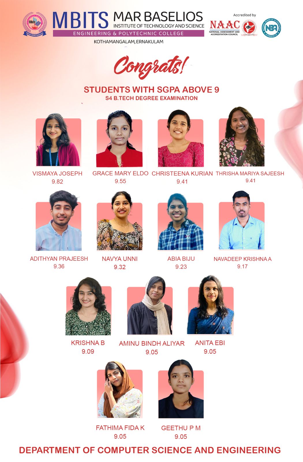 Congratulations to students with SGPA above 9 from S4 BTech Degree Examination May 2025 from Department of Computer Science and Engineering
