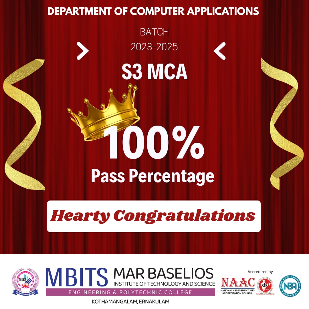 Hearty Congratulations to the Students of S3 MCA 2023 –  2025 Batch for achieving 100% Pass Percentage