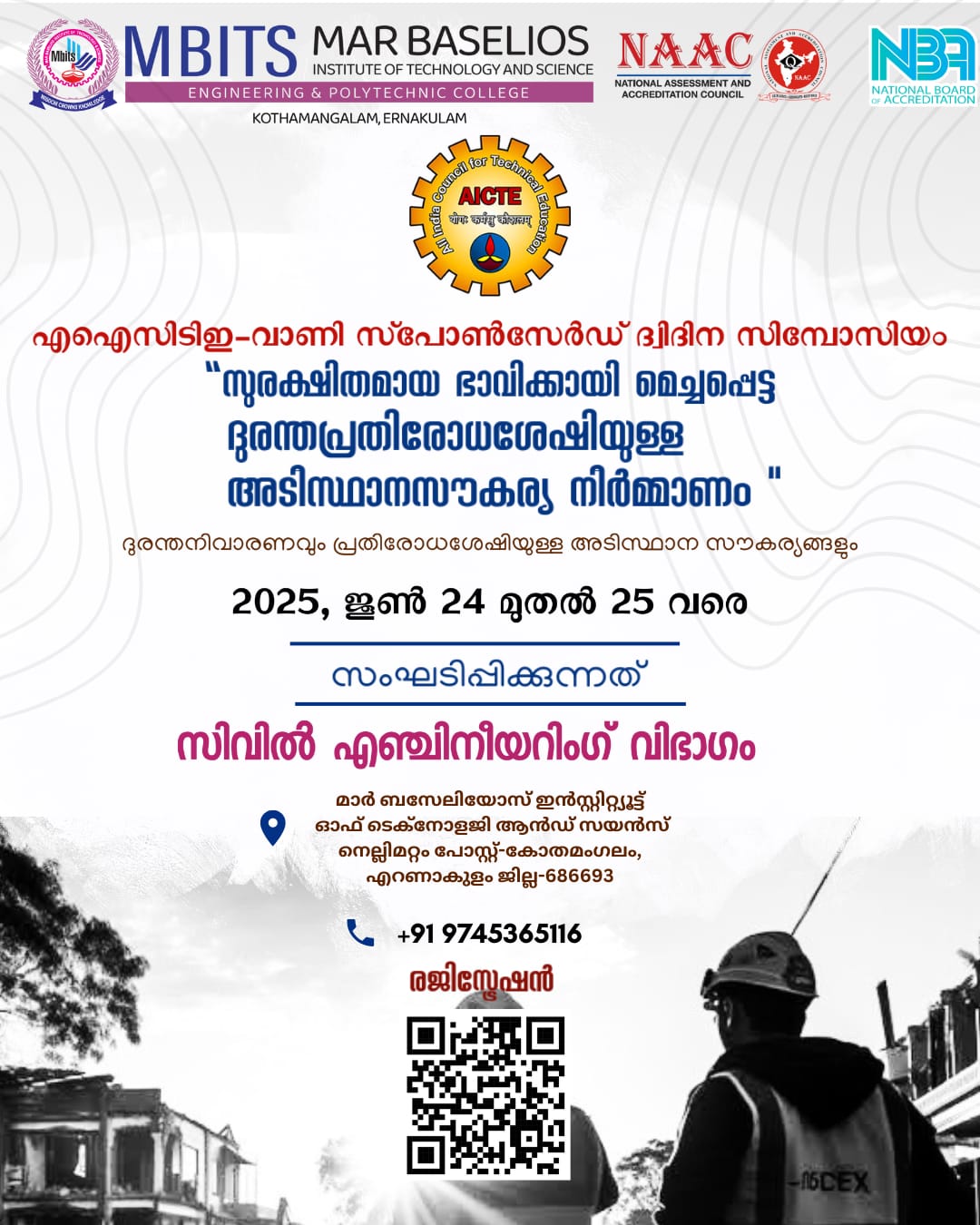 The Department of Civil Engineering at Mar Baselios Institute of Technology and Science (MBITS), Kothamangalam is organising an AICTE sponsored 2-day symposium in the regional language (Malayalam) titled “Building Better Disaster Resilient Infrastructure for a Safer Future” in the Emerging area Disaster Management and Resilient Infrastructure, under AICTE-VAANI scheme from 24th to 25th of June 2025 in offline mode.