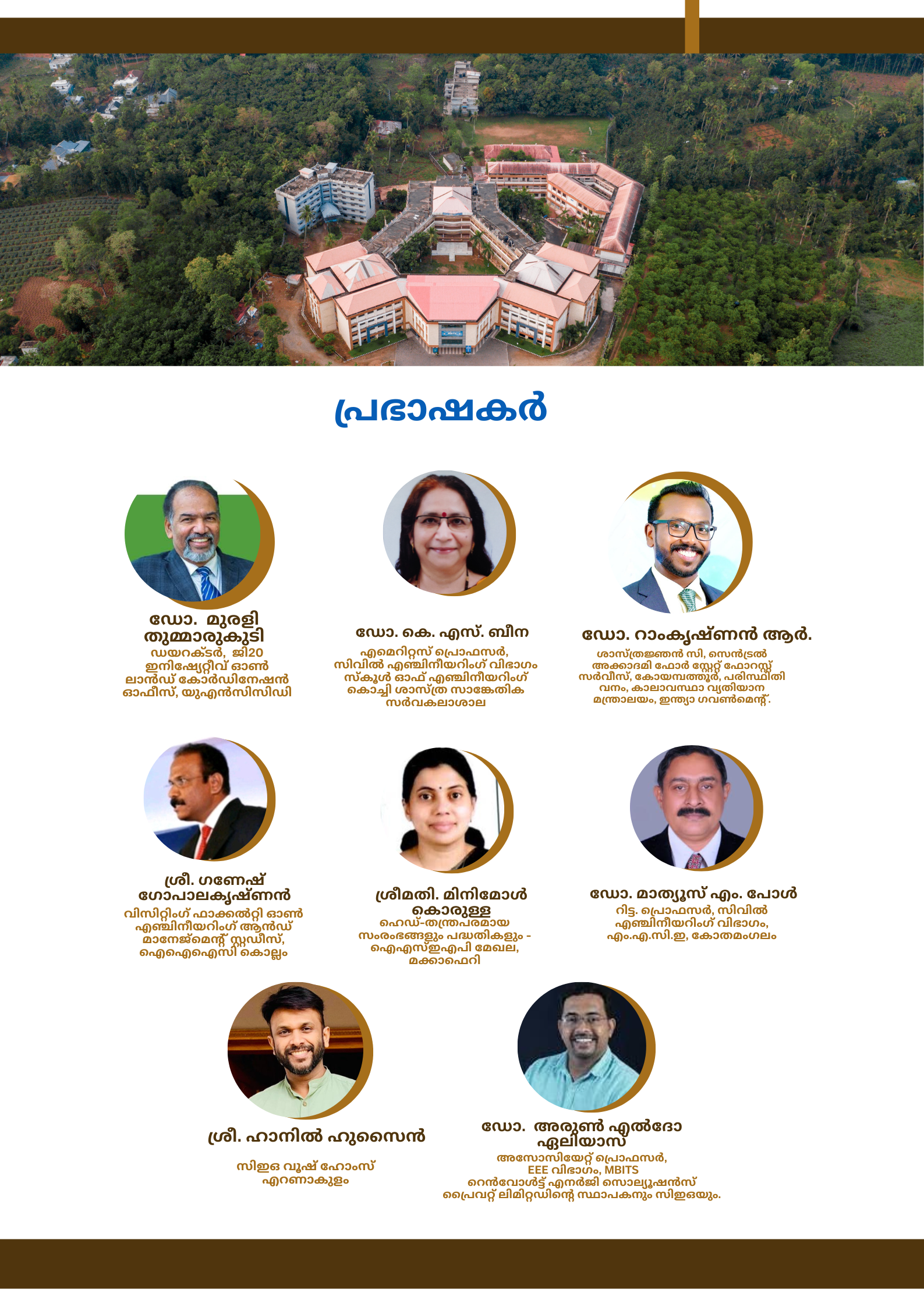 മാർ ബസേലിയോസ് ഇൻസ്റ്റിറ്റ്യൂട്ട് ഓഫ് ടെക്നോളജി ആൻഡ് സയൻസിലെ സിവിൽ എഞ്ചിനീയറിംഗ് വകുപ്പ് 2025 ജൂൺ 24 മുതൽ 25 വരെ സുരക്ഷിതമായ ഭാവിക്കായി മെച്ചപ്പെട്ട ദുരന്ത പ്രതിരോധശേഷിയുളള അടിസ്ഥാന സൗകര്യങ്ങൾ നിർമ്മിക്കുന്നതിനെക്കുറിച്ചുള്ള രണ്ട് ദിവസത്തെ സിമ്പോസിയം മലയാളത്തിൽ നടത്തുമെന്ന് അറിയിക്കുന്നതിൽ ഞങ്ങൾക്ക് സന്തോഷമുണ്ട്. നൂതന സാങ്കേതിക മേഖലകളിൽ 12 പ്രാദേശിക ഭാഷകളിലായി സമ്മേളനങ്ങൾ, സെമിനാറുകൾ, വർക്ക്ഷോപ്പുകൾ തുടങ്ങിയ പരിപാടികൾ നടത്തുന്നതിന് AICTE അംഗീകൃത സ്ഥാപനങ്ങൾക്ക് സാമ്പത്തിക സഹായം നൽകുക എന്നതാണ് AICTE-VAANI പദ്ധതിയുടെ ലക്ഷ്യം. പ്രാദേശിക ഭാഷകളിൽ സാങ്കേതിക വിദ്യാഭ്യാസത്തിൽ ഉയർന്ന നിലവാരം പ്രോത്സാഹിപ്പിക്കുന്നതിനുള്ള AICTE യുടെ പ്രതിബദ്ധതയെ ഈ പദ്ധതി പ്ര തിനിധീകരിക്കുന്നു. 22 നൂതന മേഖലകളിലെ അക്കാദമിക് വിദഗ്ധർക്കും ജോലി ചെയ്യുന്ന പ്രൊഫഷണലുകൾക്കും അവരുടെ അറിവ്, അനുഭവങ്ങൾ, നവീകരണങ്ങൾ, കണ്ടുപിടുത്തങ്ങൾ എന്നിവ പങ്കിടാനുള്ള അവസരങ്ങൾ നൽകുന്നതിലൂടെ, പ്രാദേശിക ഭാഷകളിൽ നടത്തുന്ന പരിപാടികളിലൂടെ ഒരു വിജ്ഞാന അടിത്തറ കെട്ടിപ്പടുക്കാൻ AICTE സ്ഥാപനങ്ങളെ പ്രോത്സാഹിപ്പിക്കുന്നു. ചർച്ചകളിലും അറിവ് പങ്കിടൽ പ്രവർത്തനങ്ങളിലും പങ്കെടുത്ത് പ്രാദേശിക ഭാഷകളിലെ സാങ്കേതിക വിദ്യാഭ്യാസത്തിന്റെ പുരോഗതിക്ക് സംഭാവന നൽകുന്നതിനുള്ള ഒരു വിലപ്പെട്ട വേദിയായി ഈ സിമ്പോസിയം പ്രവർത്തിക്കുന്നു.