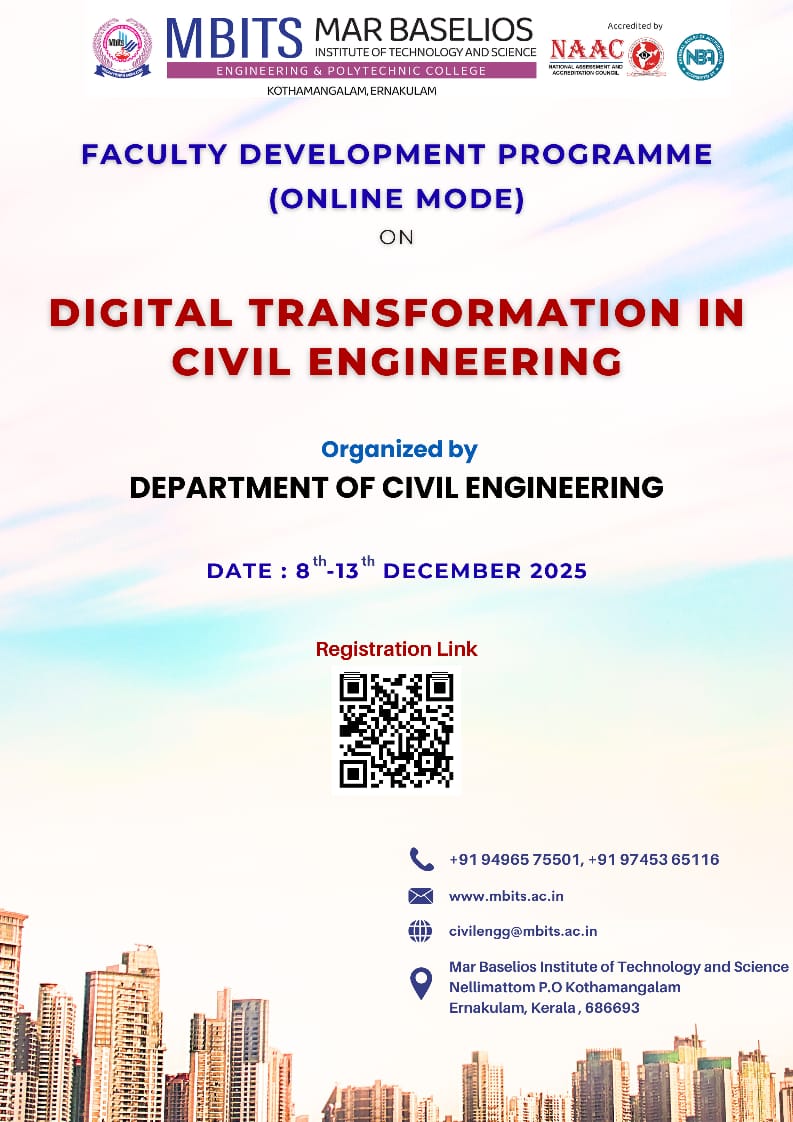 The Department of Civil Engineering at Mar Baselios Institute of Technology and Science (MBITS), Kothamangalam is organising Six Days Faculty Development Programme titled “Digital Transformation in Civil Engineering” from 8th to 13th of December 2025 in online mode.